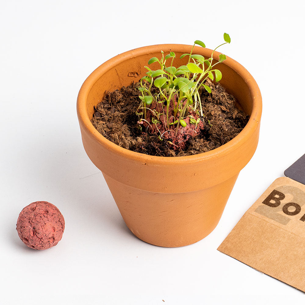 Le bombe di semi sono fatte a mano, utilizzando il metodo Nendo Dango, sviluppato dal giapponese Masanobu Fukuoka più di 70 anni fa. Questa tecnica naturale consiste nell’incapsulare i semi con argilla e materia organica. In questo modo preserviamo i semi per lungo tempo e otteniamo il successo nella germinazione.